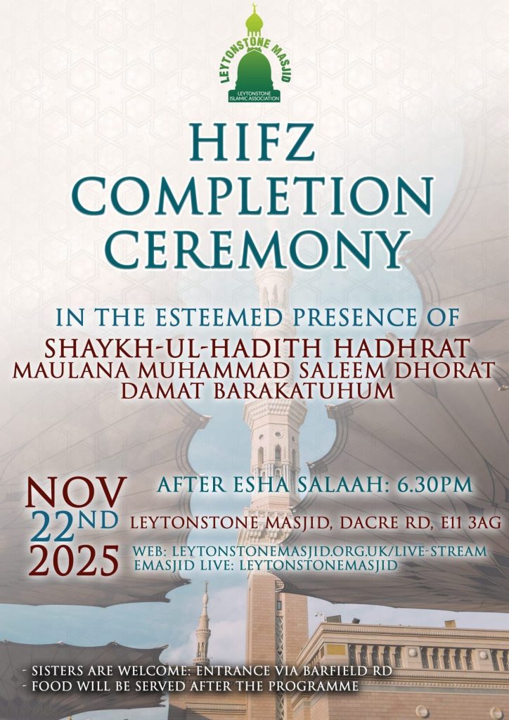 Hifz Completion Ceremony – 22nd NovPublished by Communications on Sat 15 November 2025Sat 15 November 2025 Categories: AnnouncementFeaturedIslamic Programmes