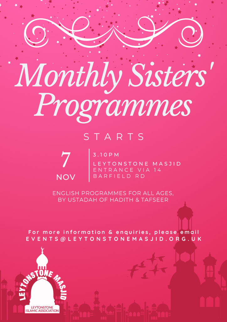 Monthly Sisters Programmes to start this Sunday for all ages, by Ustadah of Hadith and Tafseer.
