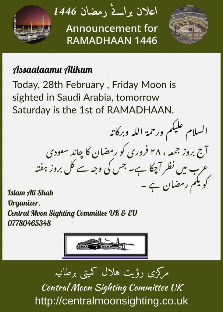 1st Ramadhan 1446 will be on Saturday 1st March, with Taraweeh starting in the evening of Friday 28th February 2025.