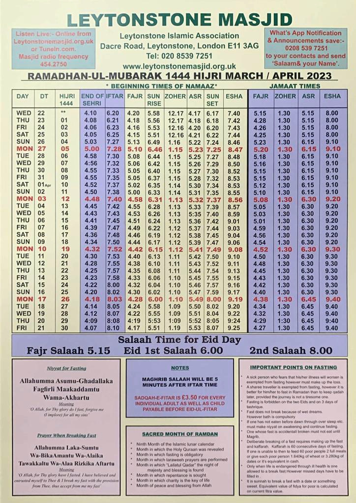 Ramadhan Timetable 1444 / 2023Published by Communications on Wed 22 March 2023Wed 22 March 2023 Please see below for our Ramadhan timetable Categories: AnnouncementFeatured