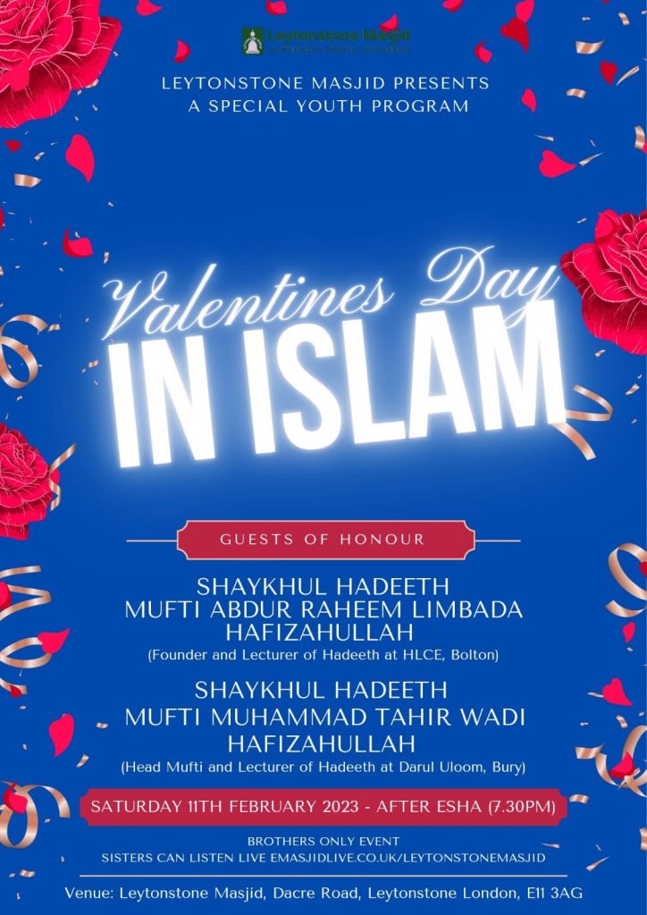 Valentines Day in IslamPublished by Communications on Tue 7 February 2023Tue 7 February 2023 Special Youth Programme this Saturday, After Isha. Categories: AnnouncementEventIslamic Programmes