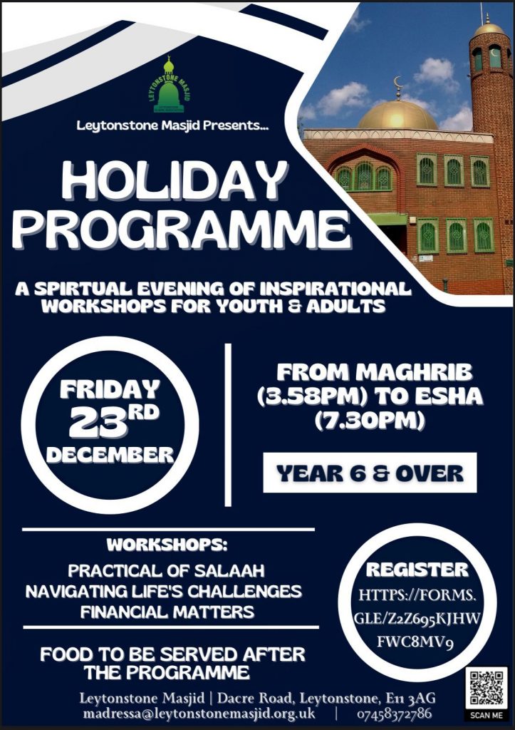 Winter Holiday ProgrammePublished by Communications on Sat 17 December 2022Sat 17 December 2022 A spiritual evening of inspirational workshops for youth and adults. Register here Categories: AnnouncementEventFeaturedIslamic Programmes